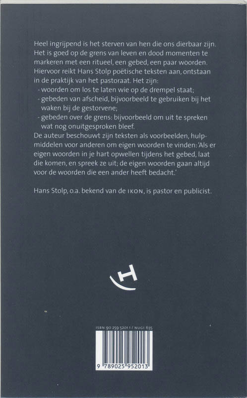 Heel ingrijpend is het sterven van hen die ons dierbaar zijn. Het is goed op de grens van leven en dood momenten te markeren met een ritueel, een gebed, een paar woorden. Hiervoor reikt Hans Stolp poëtische teksten aan, ontstaan in de praktijk van het pastoraat: - Woorden om los te laten wie op de drempel staat; - Gebeden van afscheid, bijvoorbeeld te gebruiken bij het waken bij de gestorvene; - Gebeden over de grens: bijvoorbeeld om uit te spreken wat nog onuitgesproken bleef. De auteur beschouwt zijn teksten als voorbeelden, hulpmiddelen voor anderen om eigen woorden te vinden: 'Als er eigen woorden in je hart opwellen tijdens het gebed, laat die komen, en spreek ze uit; de iegen woorden gaan altijd voor de woorden die een ander heeft bedacht.'