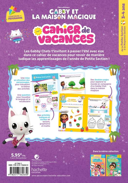 Les Gabby Chats t’invitent à passer l’été avec eux dans ce cahier de vacances pour revoir de manière ludique les apprentissages de l’année de Petite Section !