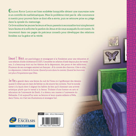 Galéane Raton Laveur est bien embêtée lorsqu’elle obtient une mauvaise note à un contrôle de mathématiques. Mais le problème n’est pas là : elle commence à mentir pour pouvoir faire ce dont elle a envie, puis se retrouve prise au piège dans la spirale du mensonge. Ce livre aidera les jeunes lecteurs et leurs parents à reconnaître tout simplement leurs fautes et à solliciter le pardon de Jésus et de ceux auxquels ils ont menti. Ils trouveront dans ces pages de précieux conseils pour développer des relations fondées sur la grâce et la vérité.