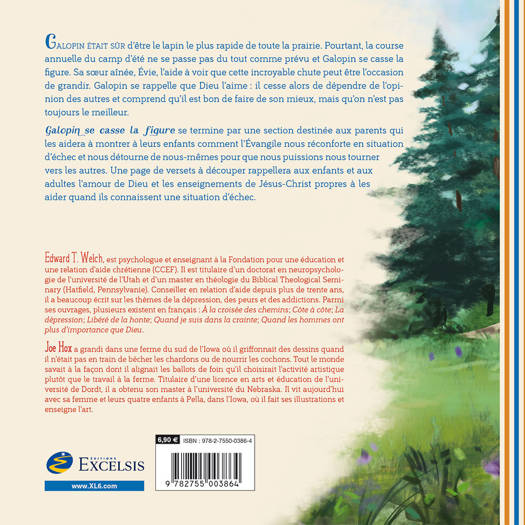Galopin était sûr d’être le lapin le plus rapide de toute la prairie. Pourtant, la course annuelle du camp d’été ne se passe pas du tout comme prévu et Galopin se casse la figure. Sa soeur aînée, Évie, l’aide à voir que cette incroyable chute peut être l’occasion de grandir. Galopin se rappelle que Dieu l’aime : il cesse alors de dépendre de l’opinion des autres et comprend qu’il est bon de faire de son mieux, mais qu’on n’est pas toujours le meilleur. Galopin se casse la figure se termine par une section destinée aux parents qui les aidera à montrer à leurs enfants comment l’Évangile nous réconforte en situation d’échec et nous détourne de nous-mêmes pour que nous puissions nous tourner vers les autres. Une page de versets à découper rappellera aux enfants et aux adultes l’amour de Dieu et les enseignements de Jésus-Christ propres à les aider quand ils connaissent une situation d’échec.