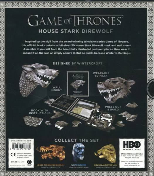 Honour the noble houses of Westeros, and warn others of the coming winter with the official Game of Thrones 3D Mask & Wall Mount series. Using Wintercroft's fantastic 3D poly-style mask designs, take these iconic house sigils and create easy-to-make masks to either wear, or mount on your wall as trophies. The Starks say that Winter is coming - show that you're preparing for the cold too with this fantastic mount, perfect for any Game of Thrones fan's home.