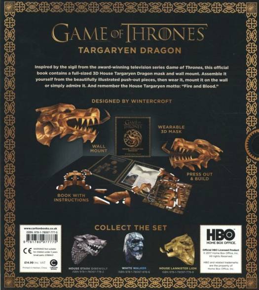 Honour the noble houses of Westeros, and warn others of the coming winter with the official Game of Thrones 3D Mask and Wall Mount series. Using Wintercroft's fantastic 3D poly-style mask designs, take these iconic house sigils and create easy-to-make masks to either wear, or mount on your wall as trophies. The Targaryens take what they want though "Fire and blood" - show you do the same with this fantastic mount, perfect for any Game of Thrones fan's home.