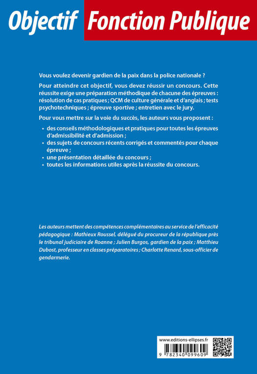 Cet ouvrage propose une préparation méthodique de chacune des épreuves du concours de gardien de la paix. Cas pratique avec des éléments de droit pénal, culture générale, épreuve de langue, tests psychotechniques, épreuve sportive, sans oublier l’oral : chaque épreuve est abordée, avec des exercices, des conseils méthodologiques et/ou des sujets corrigés.