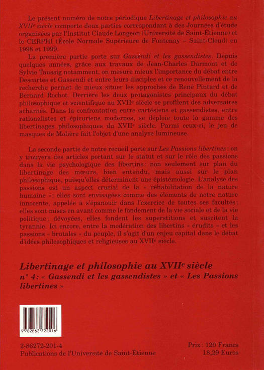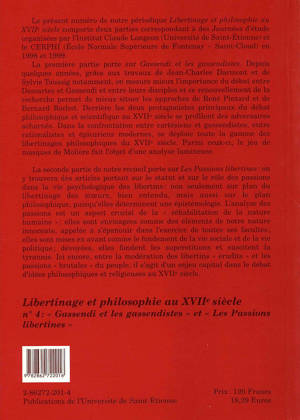 Dans la confrontation entre cartésiens et gassendistes, entre rationalistes et épicuriens modernes, se déploie toute la gamme des libertinages philosophiques du XVIIe siècle. Étapes de ce débat. Dans la seconde partie, articles sur le statut et le rôle des passions dans la vie psychologique des libertins : l'analyse des passions étant un aspect crucial de la "réhabilitation de la nature humaine".