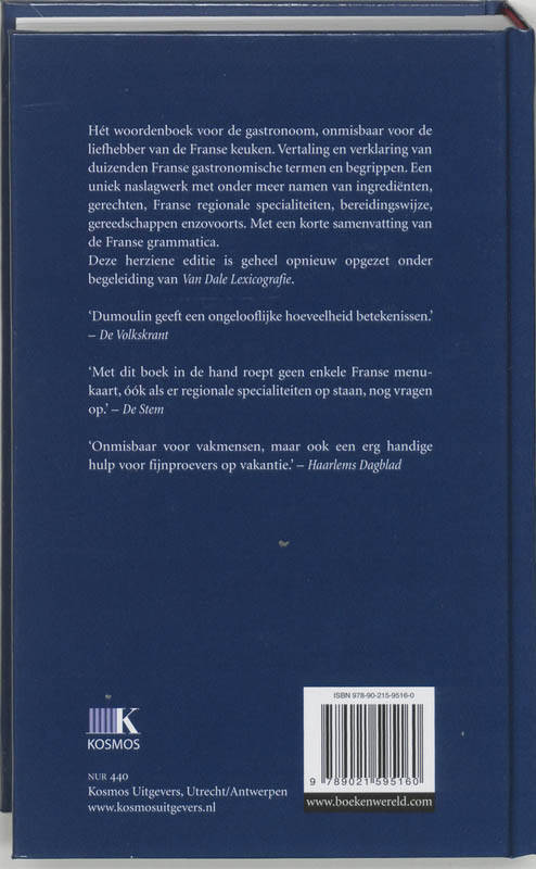 Hét woordenboek voor de gastronoom, onmisbaar voor de liefhebber van de Franse keuken. Vertaling en verklaring van duizenden Franse gastronomische termen en begrippen. Een uniek naslagwerk met ondermeer namen van ingrediënten, gerechten, Franse regionale specialiteiten, bereidingswijze, gereedschappen enzovoorts. Met een korte samenvatting van de Franse grammatica. Deze herziene editie is geheel opnieuw opgezet onder begeleiding van Van Dale Lexicografie. Pers