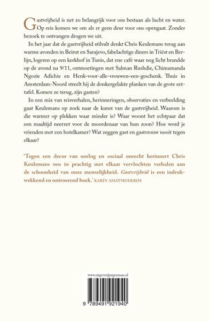 ‘Tegen een decor van oorlog en sociaal onrecht herinnert Chris Keulemans ons in prachtig met elkaar vervlochten verhalen aan de schoonheid van onze menselijkheid. Gastvrijheid is een indrukwekkend en ontroerend boek.’ KARIN AMATMOEKRIM