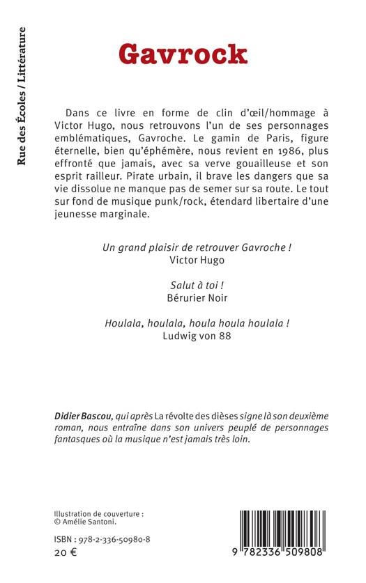 Dans ce livre en forme de clin d'oeil/hommage à Victor Hugo, nous retrouvons l'un de ses personnages emblématiques, Gavroche. Le gamin de Paris, figure éternelle, bien qu'éphémère, nous revient en 1986, plus effronté que jamais, avec sa verve gouailleuse et son esprit railleur. Pirate urbain, il brave les dangers que sa vie dissolue ne manque pas de semer sur sa route. Le tout sur fond de musique punk/rock, étendard libertaire d'une jeunesse marginale.