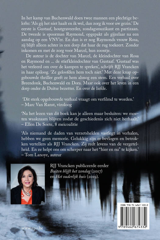 Op een dag doen twee jonge mannen in het concentratiekamp van Buchenwald elkaar een plechtige belofte: ‘Als gij het niet haalt en ik wel, dan zorg ik voor uw gezin.’ De eerste heet Gustaaf, is houtgraveerder, zondagsmuzikant en partizaan. De tweede is spoorman Raymond, opgepakt door de nazi’s als gijzelaar na een aanslag op een VNV’er in zijn dorp. En dan is er nog Raymonds vrouw Rosa. Na zijn arrestatie blijft ze overeind in een dorp dat haar de rug toekeert, zonder inkomen en met de zorg voor Marcel, hun zoon. Sommige verhalen moeten opgeschreven worden. 'Ge wint geen oorlog zonder verzet' is zo’n verhaal. De auteur is de dochter van Marcel, de kleindochter van Rosa en Raymond en ... de stiefkleindochter van Gustaaf. In dit knap opgebouwde boek laat ze de kleine oorlogen van de vier door elkaar vloeien. Over Breendonk, Buchenwald en Dora. Maar ook over het dagdagelijkse leven in een dorp onder de Duitse bezetter. En over de liefde. ‘Gustaaf was het verleerd over de kampen te spreken’, schrijft Rita Vrancken in haar epiloog. ‘Ze geloofden hem toch niet.’ Met deze thriller geeft ze hem alsnog een stem.