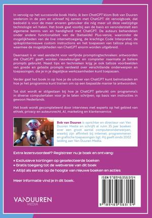 In vervolg op het succesvolle boek Hallo, ik ben ChatGPT klom Bob van Duuren wederom in de pen en schreef hij samen met ChatGPT dit vervolgboek, dat bedoeld is voor de meer ervaren gebruiker die nóg meer uit deze veelzijdige technologie wil halen. Het boek gaat voorbij aan de basis en veronderstelt een algemene kennis van en handigheid met ChatGPT. De auteurs behandelen onder andere functionaliteit van de (betaalde) Plus-versie, waaronder de mogelijkheden van de live internettoegang, de krachtige Code Interpreter, de spiksplinternieuwe custom instructions en het toepassen van talloze plug-ins waarmee de mogelijkheden van ChatGPT enorm worden uitgebreid.