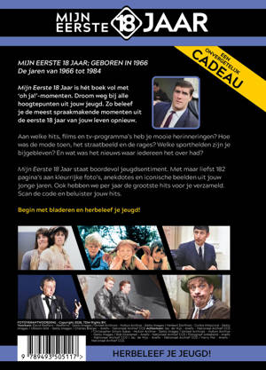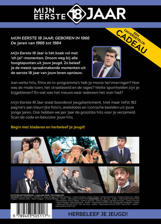 Mijn Eerste 18 Jaar staat boordevol jeugdsentiment. Met maar liefst 182 pagina’s aan kleurrijke foto’s, anekdotes en iconische beelden uit jouw jonge jaren. Ook hebben we per jaar de grootste hits voor je verzameld. Scan de code en beluister jouw hits.