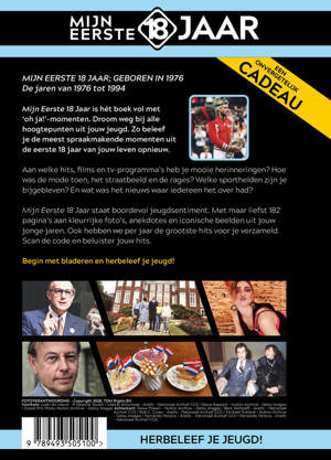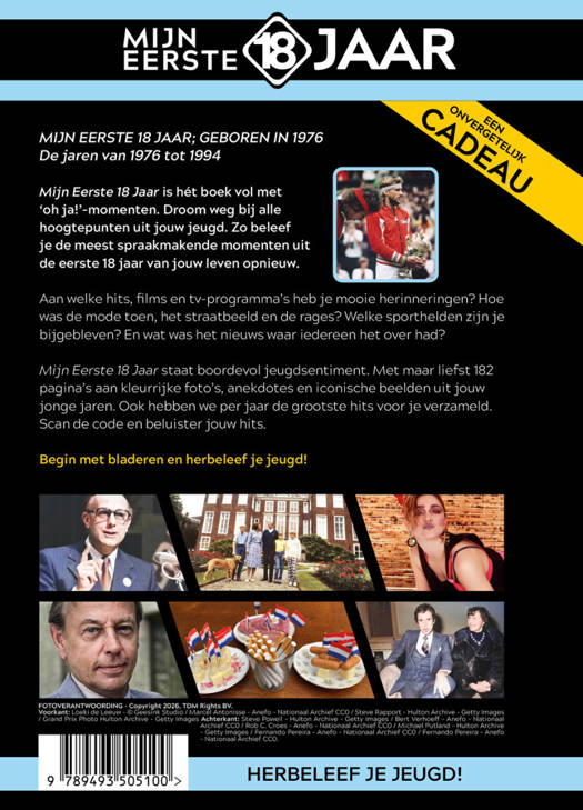 Mijn Eerste 18 Jaar staat boordevol jeugdsentiment. Met maar liefst 182 pagina’s aan kleurrijke foto’s, anekdotes en iconische beelden uit jouw jonge jaren. Ook hebben we per jaar de grootste hits voor je verzameld. Scan de code en beluister jouw hits.