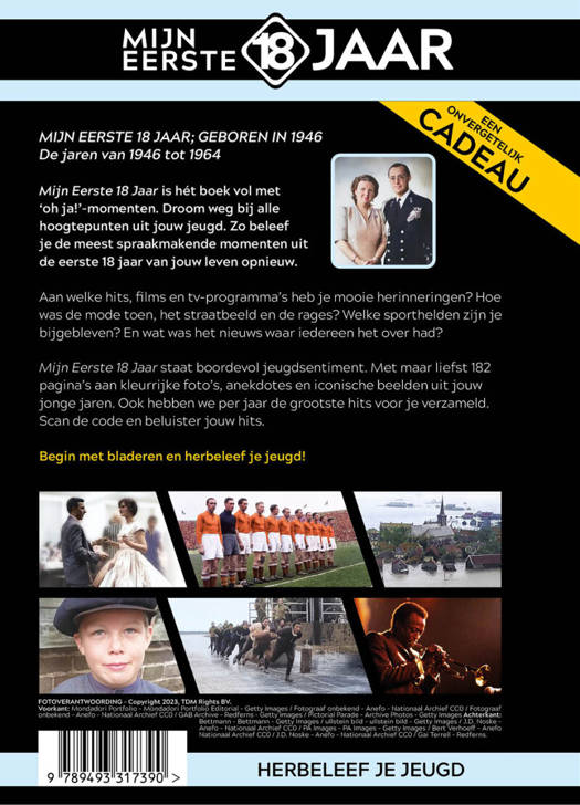 Mijn Eerste 18 Jaar staat boordevol jeugdsentiment. Met maar liefst 182 pagina’s aan kleurrijke foto’s, anekdotes en iconische beelden uit jouw jonge jaren. Ook hebben we per jaar de grootste hits voor je verzameld. Scan de code en beluister jouw hits.