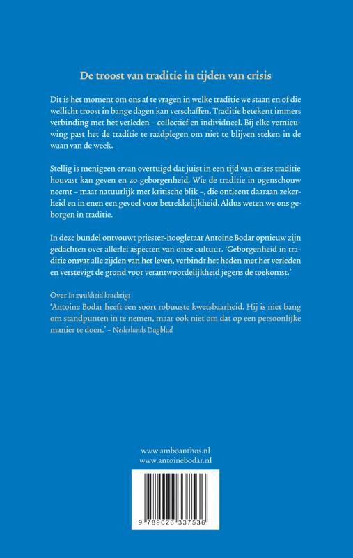 Antoine Bodar beschouwt de rol van traditie in de huidige tijd. Dit is het moment om ons af te vragen in welke traditie we staan en of die wellicht troost in bange dagen kan verschaffen. Traditie betekent immers verbinding met het verleden – collectief én individueel. Bij elke vernieuwing past het de traditie te raadplegen om niet te blijven steken in de waan van de week. Stellig is menigeen ervan overtuigd dat juist in een tijd van crises traditie houvast kan geven en zo geborgenheid. Wie de traditie in ogenschouw neemt – maar natuurlijk met kritische blik –, die ontleent daaraan zekerheid en een gevoel voor betrekkelijkheid. Aldus weten we ons geborgen in traditie.