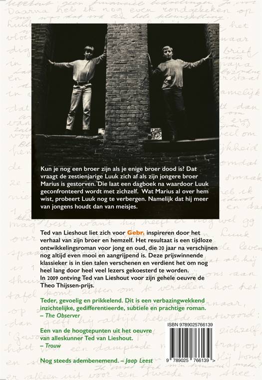 'Gebr.' is een diep ontroerende, deels autobiografische, jeugdroman geschreven door Ted van Lieshout. Deze tijdloze coming-of-age-roman vertelt het verhaal van Luuk, een jongen die opgroeit in de schaduw van zijn overleden jongere broer, Marius. Met zijn poëtische schrijfstijl biedt Ted van Lieshout een diepgaande inkijk in de thema's van rouw, verlies en familiebanden.Kun je nog een broer zijn als je enige broer dood is? Deze vraag houdt de zestienjarige Luuk bezig nadat zijn jongere broer Marius is gestorven. Elk familielid verwerkt het verlies op zijn eigen manier. Het dagboek dat Marius heeft nagelaten onthult diepgaande geheimen, waardoor Luuk geconfronteerd wordt met zichzelf. Met zijn innerlijke strijd komt ook het besef over zijn eigen geaardheid: Luuk ontdekt dat hij meer gevoelens heeft voor jongens dan voor meisjes.Dit prijswinnende verhaal, 'Gebr.', is inmiddels in tien talen vertaald. In 2009 ontving Ted van Lieshout de prestigieuze Theo Thijssen-prijs voor zijn gehele oeuvre. Ted van Lieshout heeft een indrukwekkende en vaak bekroonde literaire carrière opgebouwd. Voor 'Gebr.' liet hij zich inspireren door zijn eigen verhaal en dat van zijn broer, wat heeft geresulteerd in een prachtige ontwikkelingsroman die zowel jonge als volwassen lezers zal aanspreken. Geschikt voor lezers vanaf 12 jaar en ouder.