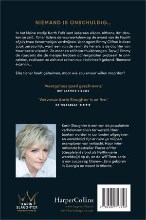 Over eerder werk: 'Geweldig goed geschreven. Voorlopig stoot niemand Karin Slaughter van haar troon.' Humo 'Al haar thrillers hebben complexe, meeslepende plots.' VN Detective en Thrillergids 'Vakvrouw Karin Slaughter is on fire.' De Telegraaf