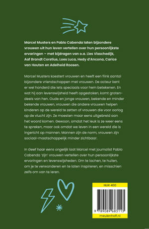 Marcel Musters en Pablo Cabenda laten bijzondere vrouwen uit hun leven vertellen over hun persoonlijkste ervaringen – met bijdragen van o.a. Lies Visschedijk, Aaf Brandt Corstius, Loes Luca, Olga Zuiderhoek, Hedy d’Ancona, Carice van Houten en Adelheid Roosen