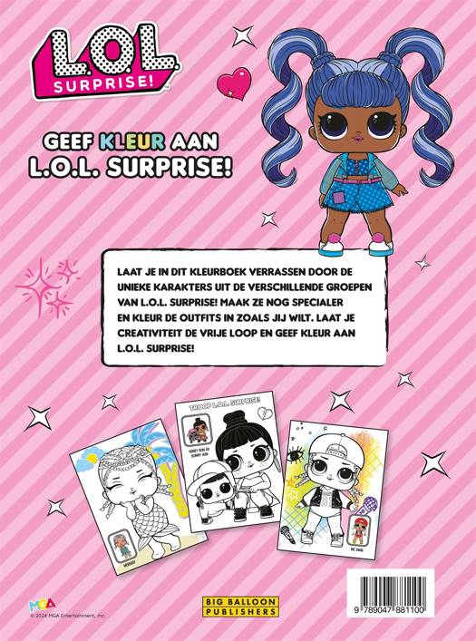 Laat je met het 'Geef kleur aan L.O.L. Surprise!'-kleurboek verrassen door de poppen uit de verschillende L.O.L. Surprise-groepen. Maak ze nóg specialer en kleur de outfits zoals jij wilt. Laat je creativiteit de vrije loop en geef kleur aan L.O.L. Surprise!