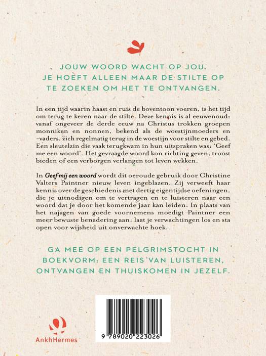 In 'Geef me een woord' wordt dit oeroude gebruik door Christine Valters Paintner nieuw leven ingeblazen. Zij verweeft haar kennis over de geschiedenis met dertig eigentijdse contemplatieve en creatieve oefeningen, die je uitnodigen om te vertragen en te luisteren naar een woord dat je door het komende jaar kan leiden. In plaats van het najagen van goede voornemens moedigt Paintner een meer bewuste benadering aan: laat je verwachtingen los en sta open voor wijsheid uit onverwachte hoek. Ze leidt je op een zachte manier door het proces van het ontvangen van je woord, het testen van de weerklank en het omarmen van de betekenis ervan. Als je over jouw woord nadenkt en ernaar leeft, merk je dat het je inzicht, duidelijkheid en doelgerichtheid biedt.