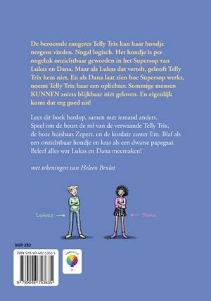 De beroemde zangeres Telly Trix kan haar hondje nergens vinden. Nogal logisch. Het hondje is weggelopen en daarna per ongeluk onzichtbaar geworden in het Supersop van Lukas en Dana. Maar als Lukas dat vertelt, wordt Telly Trix woedend. En als Dana laat zien hoe Supersop werkt, noemt Telly Trix haar een oplichter. Sommige mensen KUNNEN zoiets blijkbaar niet geloven. En eigenlijk komt dat erg goed uit!