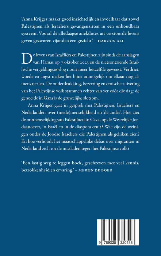 Anna Krijger gaat in gesprek met Palestijnen, Israëliers en Nederlanders over (mede)menselijkheid en ‘de ander’. Hoe ziet de ontmenselijking van Palestijnen in Gaza, op de Westelijke Jordaanoever, in Israël en in de diaspora eruit? Wie zijn de weinigen onder de Joodse Israëliers die Palestijnen als gelijken zien? En hoe verhoudt het maatschappelijke debat over migranten in Nederland zich tot de misdaden tegen het Palestijnse volk?
