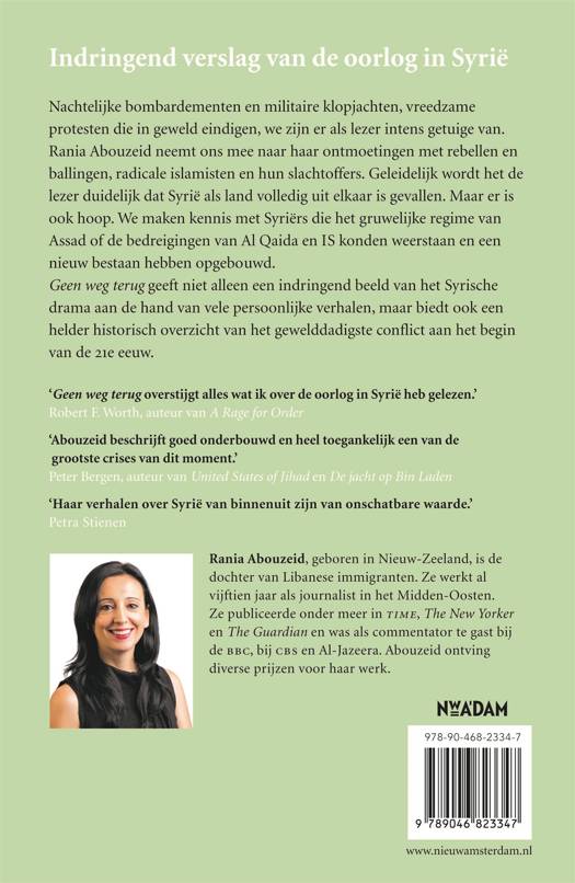 Nachtelijke bombardementen en militaire klopjachten, vreedzame protesten die in geweld eindigen, we zijn er als lezer op intense wijze getuige van. De bekroonde journalist Rania Abouzeid neemt ons mee naar haar ontmoetingen met rebellen en ballingen, radicale islamisten en hun slachtoffers. Mohammed, vader van twee kinderen, net vrijgelaten uit de gevangenis, zag in de onrust een kans voor het uitvoeren van duistere plannen. Dichter Abu Azzam werd in Homs commandant van het uit burgers bestaande Vrije Syrische Leger. In de provincie Idlib ontwrichtte de meedogenloze reactie van het regime een gezin, toen een argeloos negenjarig meisje de deur opendeed en er militairen binnenvielen, waardoor haar vader moest vluchten. Abouzeid weet de wirwar van ideologische stromingen en loyaliteiten in het Syrische conflict feilloos te ontleden. Geen weg terug is de neerslag van vijf jaar heimelijke verslaggeving aan de frontlinie. Een aangrijpend verslag van de oorlog dat ook laat zien dat zelfs tijdens een van de grootste humanitaire rampen aan het begin van de 21e eeuw de hoop levend blijft.
