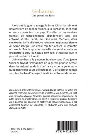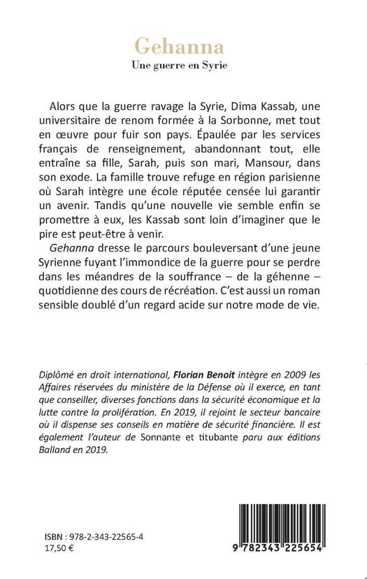 Alors que la guerre ravage la Syrie, Dima Kassab, une universitaire de renom formée à la Sorbonne, met tout en oeuvre pour fuir son pays. Épaulée par les services français de renseignement, abandonnant tout, elle entraîne sa fille, Sarah, puis son mari, Mansour, dans son exode. La famille trouve refuge en région parisienne où Sarah intègre une école réputée censée lui garantir un avenir. Tandis qu'une nouvelle vie semble enfin se promettre à eux, les Kassab sont loin d'imaginer que le pire est peut-être à venir. Gehanna dresse le parcours bouleversant d'une jeune Syrienne fuyant l'immondice de la guerre pour se perdre dans les méandres de la souffrance - de la géhenne - quotidienne des cours de récréation. C'est aussi un roman sensible doublé d'un regard acide sur notre mode de vie.