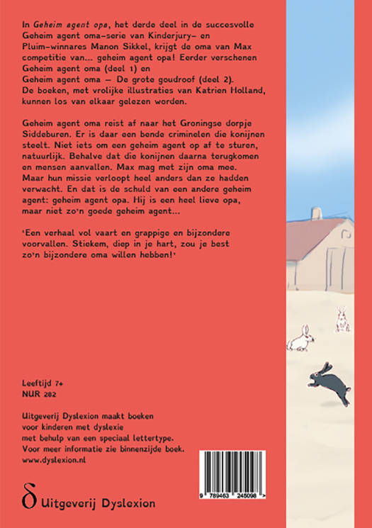 In Geheim agent opa, het derde deel in de succesvolle Geheim agent oma-serie van Kinderjury- en Pluim-winnares Manon Sikkel, krijgt de oma van Max competitie van… geheim agent opa! Eerder verschenen Geheim agent oma (deel 1) en Geheim agent oma – De grote goudroof (deel 2). De boeken, met vrolijke illustraties van Katrien Holland, kunnen los van elkaar gelezen worden. Geheim agent oma reist af naar het Groningse dorpje Siddeburen. Er is daar een bende criminelen die konijnen steelt. Niet iets om een geheim agent op af te sturen, natuurlijk. Behalve dat die konijnen daarna terugkomen en mensen aanvallen. Max mag met zijn oma mee. Maar hun missie verloopt heel anders dan ze hadden verwacht. En dat is de schuld van een andere geheim agent: geheim agent opa. Hij is een heel lieve opa, maar niet zo’n goede geheim agent… ‘Een verhaal vol vaart en grappige en bijzondere voorvallen. Stiekem, diep in je hart, zou je best zo’n bijzondere oma willen hebben!’