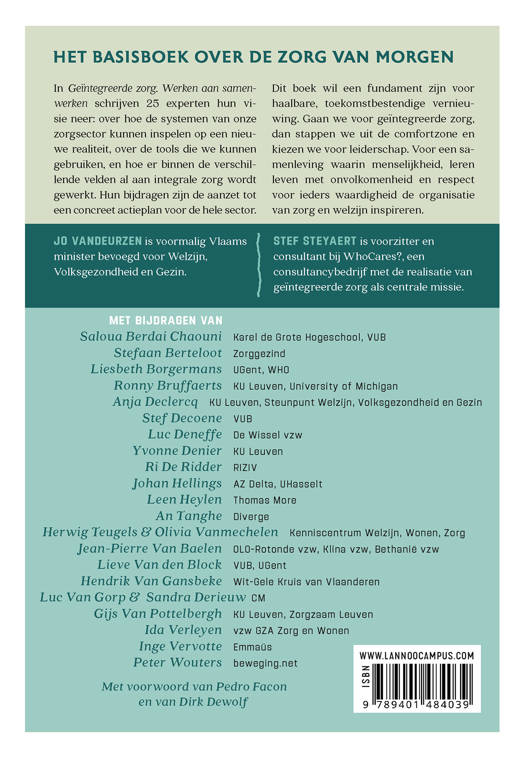 In Geïntegreerde zorg. Werken aan samenwerken schrijven 25 experten hun visie neer: over hoe de systemen van onze zorgsector kunnen inspelen op een nieuwe realiteit, over de tools die we kunnen gebruiken, en hoe er binnen de verschillende velden al aan integrale zorg wordt gewerkt. Hun bijdragen zijn de aanzet tot een concreet actieplan voor de hele sector.