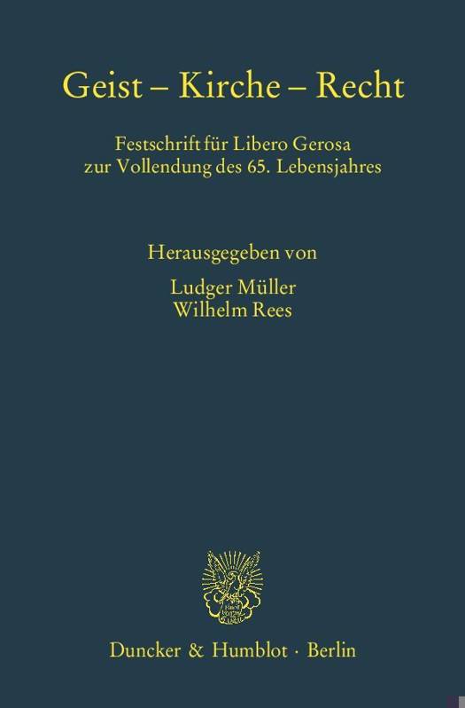 Die Libero Gerosa gewidmete Festschrift greift mit dem Titel »Geist - Kirche - Recht« den thematischen Spannungsbogen auf, unter dem der 1949 geborene Tessiner Kanonist sein umfassendes wissenschaftliches uvre in dem stetigen Bemühen um ein konsequent theologisch fundiertes Kirchenrecht geschaffen hat.