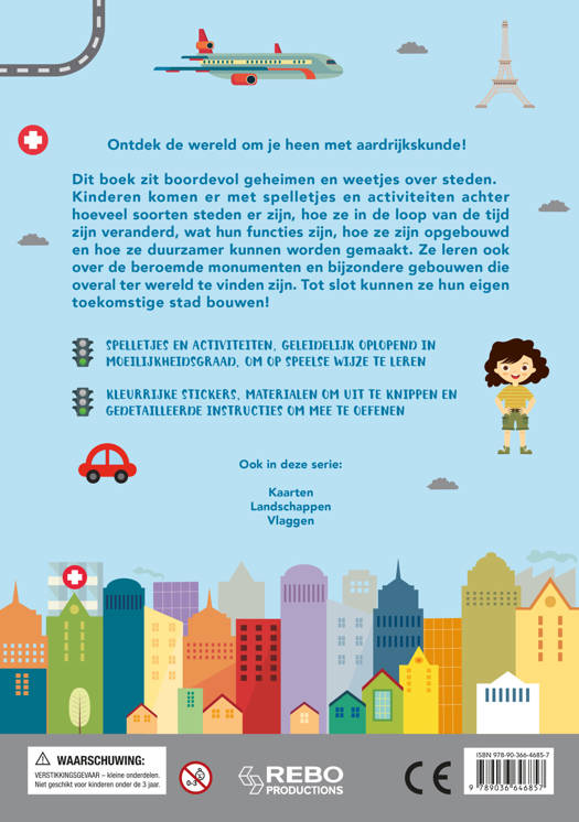 Ontdek de wereld om je heen met aardrijkskunde! Dit boek zit boordevol geheimen en weetjes over steden. Kinderen komen er met spelletjes en activiteiten achter hoeveel soorten steden er zijn, hoe ze in de loop van de tijd zijn veranderd, wat hun functies zijn, hoe ze zijn opgebouwd en hoe ze duurzamer kunnen worden gemaakt. Ze leren ook over de beroemde monumenten en bijzondere gebouwen die overal ter wereld te vinden zijn. Tot slot kunnen ze hun eigen toekomstige stad bouwen!