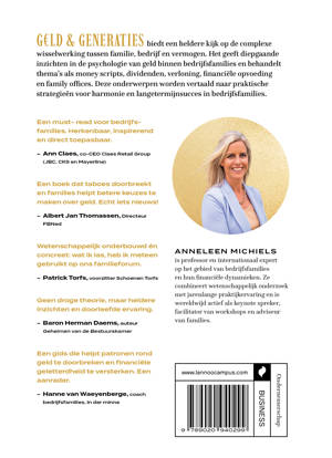 G€LD & GENERATIES biedt een heldere kijk op de complexe wisselwerking tussen familie, bedrijf en vermogen. Het geeft diepgaande inzichten in de psychologie van geld binnen bedrijfsfamilies en behandelt thema's als money scripts, dividenden, verloning, financiële opvoeding en family offices. Deze onderwerpen worden vertaald naar praktische strategieën voor harmonie en langetermijnsucces in bedrijfsfamilies.