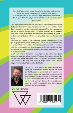 Deze wereldberoemde quote van John Lennon inspireerde journalist Tom Botte voor de interviewreeks Het Opperste Geluk in het weekblad Primo. Daarin vertrok hij van de vraag: wat is dat, geluk? Op die vraag zoeken mensen al eeuwen een antwoord. Intussen is iedereen het er ongeveer over eens: daar is niet zomaar een eenvoudig antwoord op te geven. Er bestaat geen eenduidige definitie van geluk. Laat staan van ‘het opperste geluk’. Tom Botte ging verder in zijn onderzoek: bestaat dé ultieme vorm van gelukkig zijn? En zo ja, hoe bereik je die? Zijn er tips en trucjes om daar te geraken? Voor het weekblad Primo trok de auteur de voorbije twee jaar wekelijks op bezoek bij een Bekende Vlaming, die hem vertelde wat voor hem of haar het opperste geluk betekent. Simpelweg gelukkig zijn … ook in tijden van corona. In dit boek vindt u tientallen eenvoudige tips die leiden naar geluk, aangereikt door de geïnterviewde BV’s, zoals Ben Segers, Wendy Van Wanten, Dana Winner, Werner De Smedt, Kürt Rogiers, Wim Lybaert, Helmut Lotti, Pascale Platel, Filip Joos, Nicole & Hugo, James Cooke, Christoff, Jacques Vermeire, Luc Appermont & Bart Kaëll.