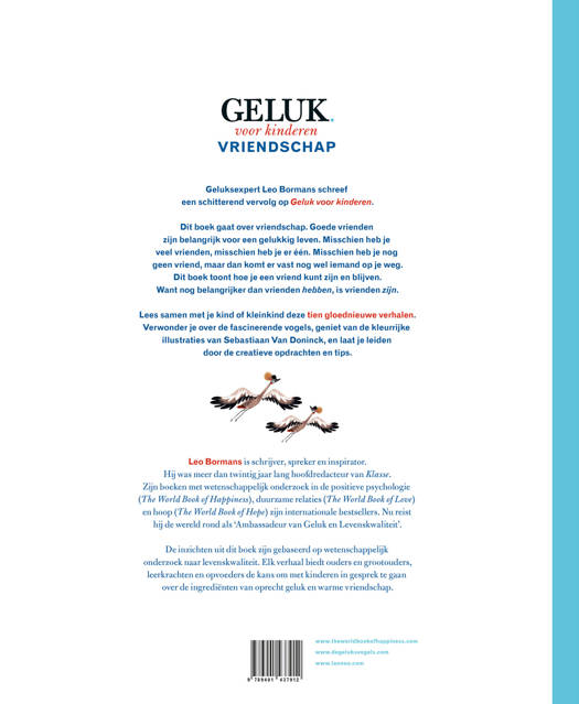 Geluksexpert Leo Bormans schreef een schitterend vervolg op Geluk voor kinderen. Dit boek gaat over vriendschap. Goede vrienden zijn belangrijk voor een gelukkig leven. Misschien heb je veel vrienden, misschien heb je er één. Misschien heb je nog geen vriend, maar dan komt er vast nog wel iemand op je weg. Dit boek toont hoe je een vriend kunt zijn en blijven. Want nog belangrijker dan vrienden hebben, is vrienden zijn. Lees samen met je kind of kleinkind deze tien gloednieuwe verhalen. Verwonder je over de fascinerende vogels, geniet van de kleurrijke illustraties van Sebastiaan Van Doninck, en laat je leiden door de creatieve opdrachten en tips. De inzichten uit dit boek zijn gebaseerd op wetenschappelijk onderzoek naar levenskwaliteit. Elk verhaal biedt ouders en grootouders, leerkrachten en opvoeders de kans om met kinderen in gesprek te gaan over de ingrediënten van oprecht geluk en warme vriendschap.van de kleurrijke illustraties van Sebastiaan Van Doninck, en laat je leiden door de creatieve opdrachten en tips.