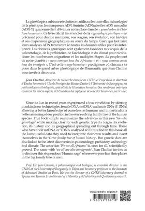 La généalogie a subi une révolution en utilisant les nouvelles technologies de la génétique, les marqueurs ADN féminin (ADNmt) et les ADN masculin (ADN-Y) qui permettent d’évaluer notre place dans le « grand arbre de l’histoire humaine ». Ce livre décrit les avancées de la « généalogie génétique » en précisant pour chaque marqueur, son origine, son évolution, son histoire et ses dispersions géographiques au cours du temps. Ceux qui font faire leurs analyses ADN trouveront ici toutes les données utiles pour les interpréter. Les données génétiques sont également associées aux acquis de la paléontologie, de la préhistoire, de l’archéologie et du climat pour reconstituer les nombreuses migrations et les multiples étapes du peuplement de notre planète : « nous sommes tous des Africains » et « nous sommes aussi tous des immigrés ». C’est cette « saga humaine » prodigieuse où chacun a sa place dans le grand arbre généalogique de l’humanité, que Jean Chaline vous invite à découvrir.