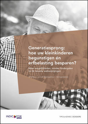 Door een generatiesprong verrmijdt u dat uw vermogen tweemaal aan erfbelasting onderworpen wordt. Daarnaast komen de erfgenamen, door de erfenis over meer begunstigden te verdelen meestal ook fin een lagere tariefschijf terecht. Dit maak een generatiesprong bijzonder interessant, zeker nu ook een gedeeltelijke generatiesprong mogelijk is. Bestel nu dit nieuwe dossier: maak uw kleinkinderen gelukkig en bespaar later erfbelasting!