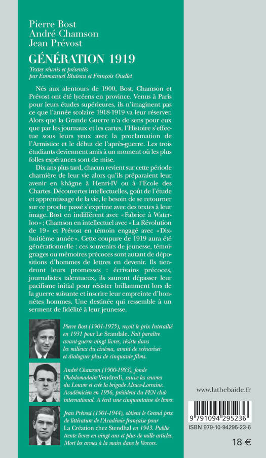 Nés aux alentours de 1900, Bost, Chamson et Prévost ont été lycéens en province. Venus à Paris pour leurs études supérieures, ils n’imaginent pas ce que l’année scolaire 1918-1919 va leur réserver. Alors que la Grande Guerre n’a de sens pour eux que par les journaux et les cartes, l’Histoire s’effectue sous leurs yeux avec la proclamation de l’Armistice et le début de l’après-guerre. Les trois étudiants deviennent amis à un moment où les plus folles espérances sont de mise. Dix ans plus tard, chacun revient sur cette période charnière de leur vie alors qu’ils préparaient leur avenir en khâgne à Henri-IV ou à l’Ecole des Chartes. Découvertes intellectuelles, goût de l’étude et apprentissage de la vie, le besoin de se retourner sur ce proche passé s’exprime avec des textes à leur image. Bost en indifférent avec « Fabrice à Waterloo » ; Chamson en intellectuel avec « La Révolution de 19 » et Prévost en témoin engagé avec « Dix-huitième année ». Cette coupure de 1919 aura été générationnelle : ces souvenirs de jeunesse, témoignages ou mémoires précoces sont autant de dépositions d’hommes de lettres en devenir. Ils tiendront leurs promesses : écrivains précoces, journalistes talentueux, ils sauront dépasser leur pacifisme initial pour résister brillamment lors de la guerre suivante et inscrire leur empreinte d’honnêtes hommes. Une destinée qui ressemble à un serment de fidélité à leur jeunesse.