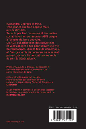 Kassandre, Mina et Georg, tous trois un peu marginaux et révoltés, ont un point commun que la plupart des gens ignorent : un pouvoir terrifiant... D'un pensionnat luxueux en Suisse aux quartiers chauds de Naples, la traque commence car leurs dons sont convoités par de redoutables puissances. Après le succès des «Autodafeurs »et avant celui de« Dix», Marine Carteron nous livrait une série empreinte de fantastique et d'action. Vendue à plus de 50 000 exemplaires, acclamée par la presse et les libraires, elle fut élue "meilleur roman jeunesse 2016" par la rédaction du magazine Lire. Découvrez ou redécouvrez ce classique du Rouergue jeunesse dans son édition poche "collector".