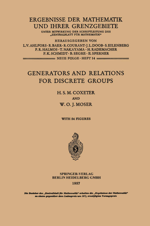 When we began to consider the scope of this book, we envisaged a catalogue supplying at least one abstract definition for any finitely- generated group that the reader might propose. But we soon realized that more or less arbitrary restrictions are necessary, because interesting groups are so numerous. For permutation groups of degree 8 or less (i. e., subgroups of e ), the reader cannot do better than consult the 8 tables of JosEPHINE BuRNS (1915), while keeping an eye open for misprints. Our own tables (on pages 134-143) deal with groups of low order, finiteandinfinite groups of congruent transformations, symmetric and alternating groups, linear fractional groups, and groups generated by reflections in real Euclidean space of any number of dimensions. The best substitute foramoreextensive catalogue is the description (in Chapter 2) of a method whereby the reader can easily work out his own abstract definition for almost any given finite group. This method is sufficiently mechanical for the use of an electronic computer. There is also a topological method (Chapter 3), suitable not only for groups of low order but also for some infinite groups. This involves choosing a set of generators, constructing a certain graph (the Cayley diagram or DEHNsehe Gruppenbild), and embedding the graph into a surface. Cases in which the surface is a sphere or a plane are described in Chapter 4, where we obtain algebraically, and verify topologically, an abstract definition for each of the 17 space groups of two-dimensional crystallography.