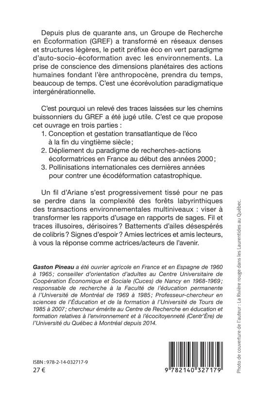 Depuis plus de quarante ans, un Groupe de Recherche en Écoformation (GREF) a transformé en réseaux denses et structures légères, le petit préfixe éco en vert paradigme d'auto-socio-écoformation avec les environnements. La prise de conscience des dimensions planétaires des actions humaines fondant l'ère anthropocène, prendra du temps, beaucoup de temps. C'est une écorévolution paradigmatique intergénérationnelle. C'est pourquoi un relevé des traces laissées sur les chemins buissonniers du GREF a été jugé utile. C'est ce que propose cet ouvrage en trois parties: 1. Conception et gestation transatlantique de l'éco à la fin du vingtième siècle; 2. Dépliement du paradigme de recherches-actions écoformatrices en France au début des années 2000; 3. Pollinisations internationales ces dernières années pour contrer une écodéformation catastrophique. Un fil d'Ariane s'est progressivement tissé pour ne pas se perdre dans la complexité des forêts labyrinthiques des transactions environnementales multiniveaux: viser à transformer les rapports d'usage en rapports de sages. Fil et traces illusoires, dérisoires ? Battements d'ailes désespérés de colibris ? Signes d'espoir ? Amies lectrices et amis lecteurs, à vous la réponse comme actrices/acteurs de l'avenir.