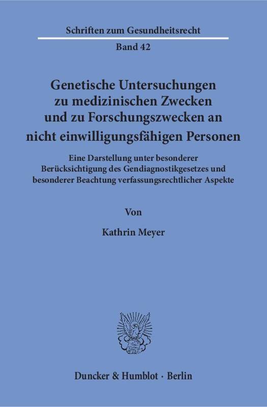 14 ff. GenDG, welche die Zulässigkeitsvoraussetzungen einer genetischen Untersuchung zu medizinischen Zwecken an nicht einwilligungsfähigen Personen regeln, einer kritischen rechtlichen Analyse und zeigt potentiellen Verbesserungsbedarf auf. Zudem wird ein Lösungsvorschlag zu Voraussetzungen und Zulässigkeit genetischer Untersuchungen zu Forschungszwecken an einwilligungsunfähigen Personen unterbreitet. Diese regelungsbedürftige Thematik fand im GenDG bisher keine Berücksichtigung.