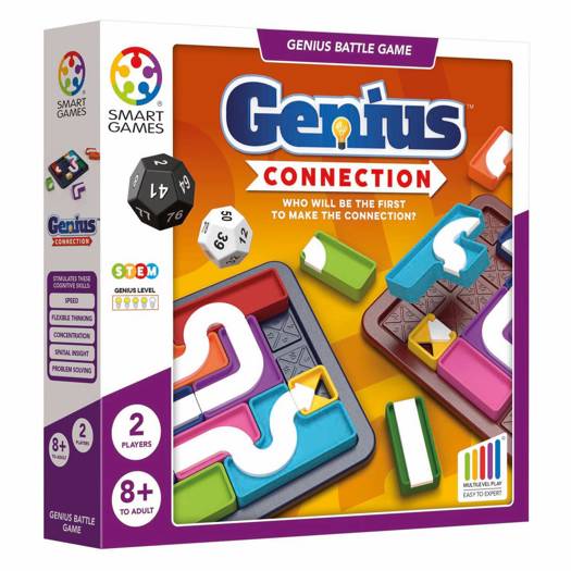Genius Connection is een puzzelspel dat je uitdaagt om je tegenstander te slim af te zijn terwijl je snel moet nadenken. Gooi de dobbelstenen en speel willekeurige uitdagingen of verken de 576 op kaarten gebaseerde puzzels, variërend van makkelijk tot moeilijk. Zit je goed op schema? Of je nu met een vriend speelt of alleen, Genius Connection is een onmisbare aanvulling op je SmartGames-collectie.