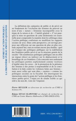 La définition des catégories de public et de privé est au fondement de l'exclusion des femmes du pouvoir au nom d'une nature féminine incompatible avec le règne de la raison et de "l'intérêt général". La mise en questions de cette dichotomie est essentielle pour comprendre la manière dont les arbitrages dans l'action publique confortent ou modifient les rapports sociaux de sexe. Quel est l'impact des politiques publiques sur la redéfinition des frontières public-privé et sur la structure genrée de la société ?