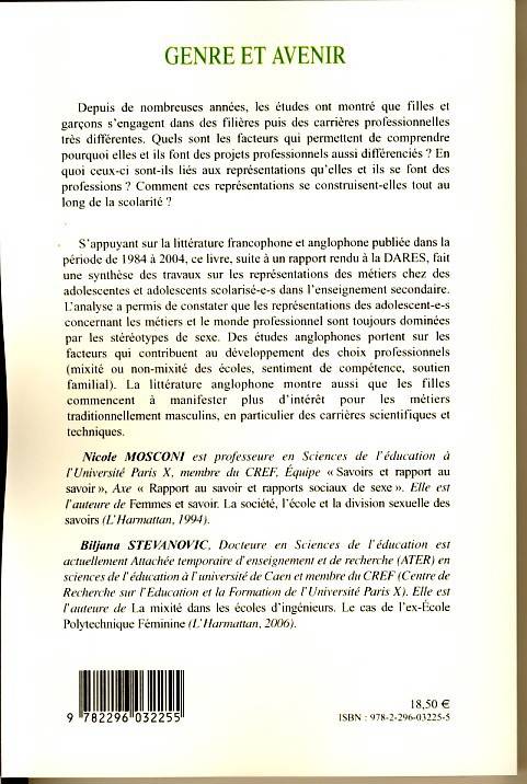 Filles et garçons s'engagent dans des filières puis des carrières professionnelles très différentes. S'appuyant sur la littérature francophone et anglophone, ce livre fait une synthèse des travaux sur les représentations des métiers chez les adolescentes et adolescents scolarisé-e-s dans l'enseignement secondaire. Les représentations des adolescent-e-s concernant les métiers et le monde professionnel apparaissent toujours dominés par les stéréotypes de sexe, même si les filles manifestent de l'intérêt pour des carrières scientifiques et techniques.