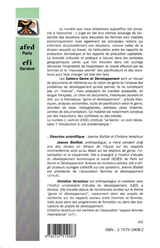 Un premier éclairage de l'ensemble des situations dans lesquelles les femmes sont insérées économiquement mais également les principales notions qui informent structurellement ces situations comme celles de la division sexuelle du travail, de l'articulation entre les rapports de production domestique et les rapports de production capitaliste. Malgré la diversité culturelle et politique dans des contextes géographiques variés, on constate l'invariabilité de l'exploitation du travail des femmes.