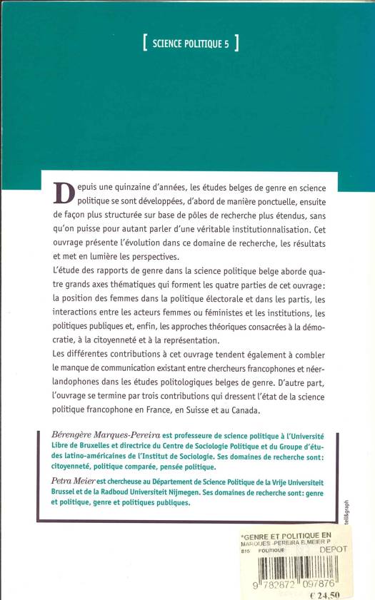 L'étude des rapports de genre dans la science politique belge aborde quatre grands axes thématiques qui forment les quatre parties de cet ouvrage: la position des femmes dans la politique électorale et dans les partis, les interactions entre les acteurs femmes ou les féministes et les institutions, les politiques publiques et, enfin, les approches théoriques consacrées à la démocratie, à la citoyenneté et à la représentation.