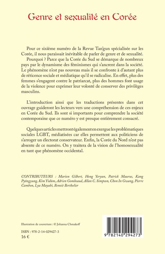 Pour ce sixième numéro de la Revue Tan'gun spécialisée sur les Corée, il nous paraissait inévitable de parler de genre et de sexualité. Pourquoi ? Parce que la Corée du Sud se démarque de nombreux pays par le dynamisme des féminismes qui s'ancrent dans la société. Le phénomène n'est pas nouveau mais il se confronte à d'autant plus de réticence sociale et médiatique qu'il se radicalise. En effet, plus des femmes s'engagent contre le patriarcat, plus des hommes font usage de la violence pour exprimer leur volonté de conserver des privilèges masculins. L'introduction ainsi que les traductions présentes dans cet ouvrage guideront les lecteurs vers une compréhension de ces enjeux en Corée du Sud. Ils sont si importants pour comprendre la société contemporaine que ce numéro y est presque entièrement consacré. Quelques articles mettront également en exergue les problématiques sociales LGBT, médiatisées car elles permettent aux politiciens de s'arroger un électorat conservateur. Enfin, la Corée du Nord n'est pas absente de ce numéro. On y traitera de la vision de l'homosexualité en tant que phénomène occidental. CONTRIBUTEURS: Marion Gilbert, Hong Yeryun, Patrick Maurus, Kang Pyôngyung, Kim Yidûm, Adrien Gombeaud, Allan C. Simpson, Chon In Gwang, Pierre Cambon, Lya Mayahi, Benoit Berthelier