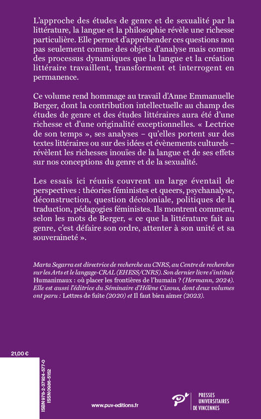 Ce volume rend hommage au travail d'Anne Emmanuelle Berger, dont la contribution intellectuelle au champ des études de genre et des études littéraires aura été d’une richesse et d’une originalité exceptionnelles. « Lectrice de son temps », ses analyses – qu'elles portent sur des textes littéraires ou sur des idées et événements culturels – révèlent les richesses inouïes de la langue et de ses effets sur nos conceptions du genre et de la sexualité.