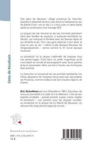 Ces gens de Bauduen, village provençal du Haut-Var, passèrent l'essentiel de leurs vies avant la naissance du lac de Sainte-Croix, mis en eau il y a tout juste un demi-siècle après la construction d'un barrage EDF. La plupart de ces femmes et de ces hommes grandirent dans des familles de paysans, à quelques kilomètres du Verdon, qui marquait la frontière avec les Basses-Alpes et qui alimente le lac. Pour ces gens attachés à leur terre, la mise en eau du lac - même si elle épargna Bauduen de l'engloutissement - sonna comme la fin d'une époque heureuse. Le provençal fut la langue maternelle de presque tous ces personnages. C'est dans ce parler magnifique qu'ils nommaient le monde et échangeaient avec leurs parents et leurs camarades. Mais une fois à l'école, seul le français était autorisé. La traduction en provençal de ces portraits représente une infime réparation de l'injustice vécue alors par ces enfants de Provence, comme d'ailleurs de tant d'autres régions de France.
