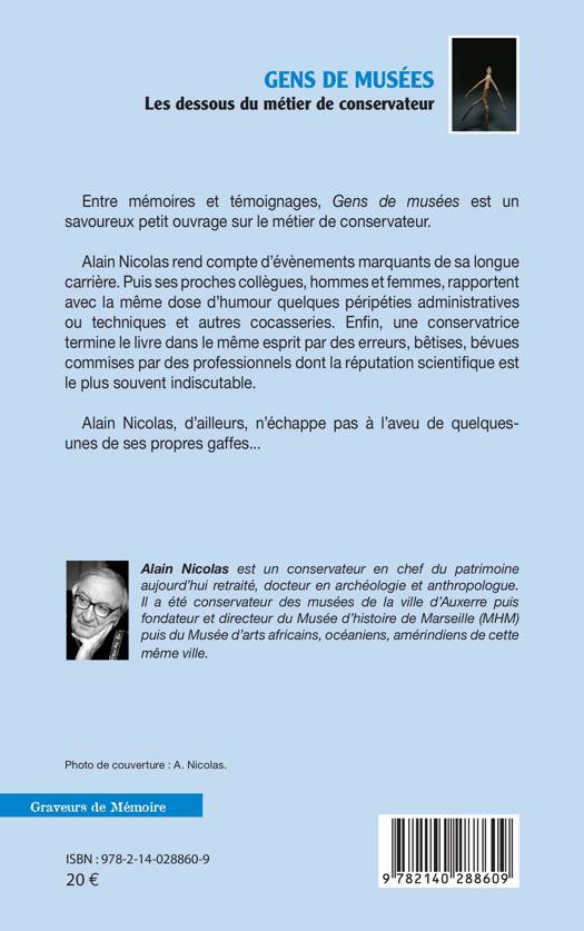 Entre mémoires et témoignages, Gens de musées est un savoureux petit ouvrage sur le métier de conservateur. Alain Nicolas rend compte d'évènements marquants de sa longue carrière. Puis ses proches collègues, hommes et femmes, rapportent avec la même dose d'humour quelques péripéties administratives ou techniques et autres cocasseries. Enfin, une conservatrice termine le livre dans le même esprit par des erreurs, bêtises, bévues commises par des professionnels dont la réputation scientifique est le plus souvent indiscutable. Alain Nicolas, d'ailleurs, n'échappe pas à l'aveu de quelques-unes de ses propres gaffes...