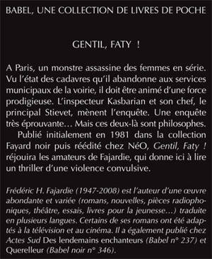 A Paris, un monstre assassine des femmes en série. Vu l?état des cadavres qu?il abandonne aux services municipaux de la voirie, il doit être animé d?une force prodigieuse. L?inspecteur Kasbarian et son chef, le principal Stievet, mènent l?enquête. Une enquête très éprouvante? Mais ces deux-là sont philosophes. Publié initialement en 1981 dans la collection Fayard noir puis réédité chez NéO, Gentil, Faty ! réjouira les amateurs de Fajardie, qui donne ici à lire un thriller d?une violence convulsive. Frédéric H. Fajardie (1947-2008) est l?auteur d?une oeuvre abondante et variée (romans, nouvelles, pièces radiophoniques, théâtre, essais, livres pour la jeunesse?) traduite en plusieurs langues. Certains de ses romans ont été adaptés à la télévision et au cinéma. Il a également publié chez Actes Sud Des lendemains enchanteurs (Babel n° 237) et Querelleur (Babel noir n° 346).
